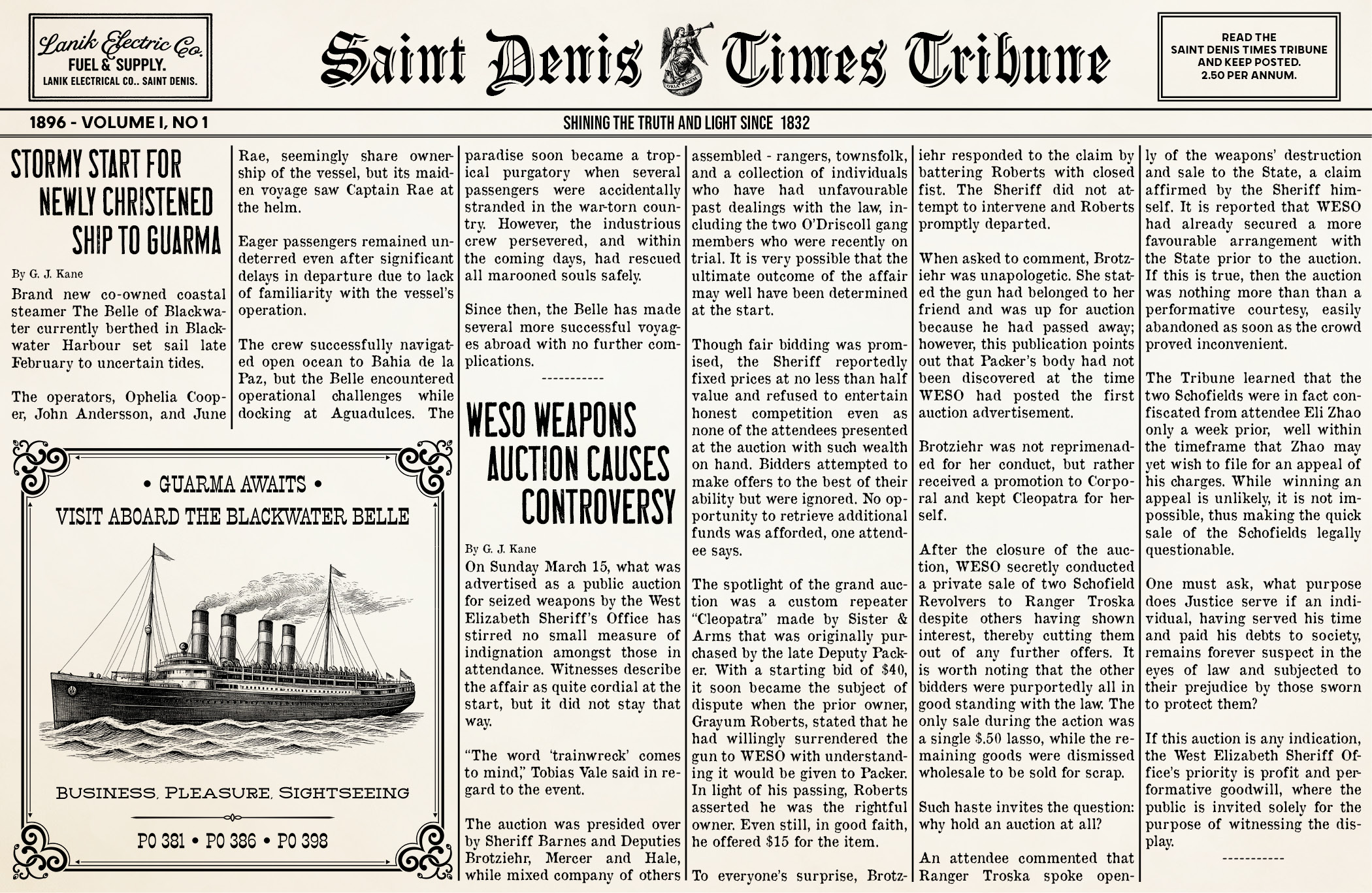 I did some research on the style of the paper in Red Dead Redemption 2. While I did not intend to mimic it exactly, I wanted to recreate certain details that would evoke the essence of the real game asset. This current version is a culmination of several other newspapers in previous servers I worked on. Over the years, I’ve improved my skills as Adobe InDesign and refined the visual style I envisioned for the paper.