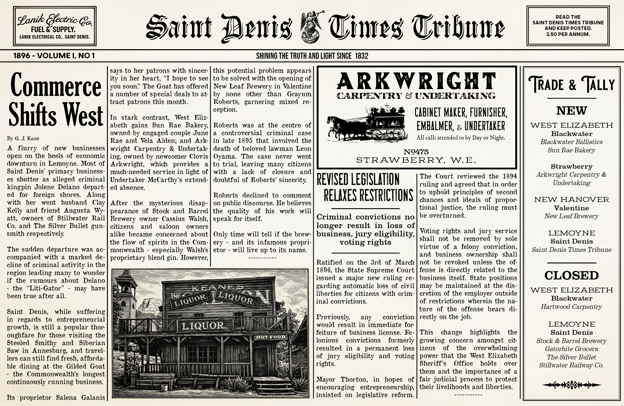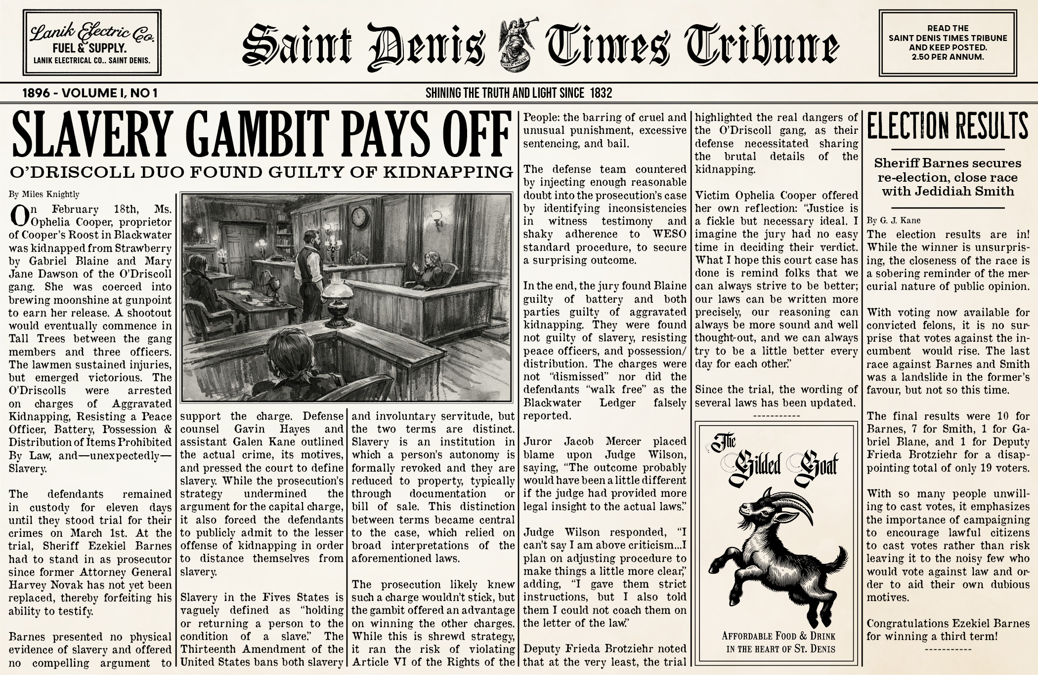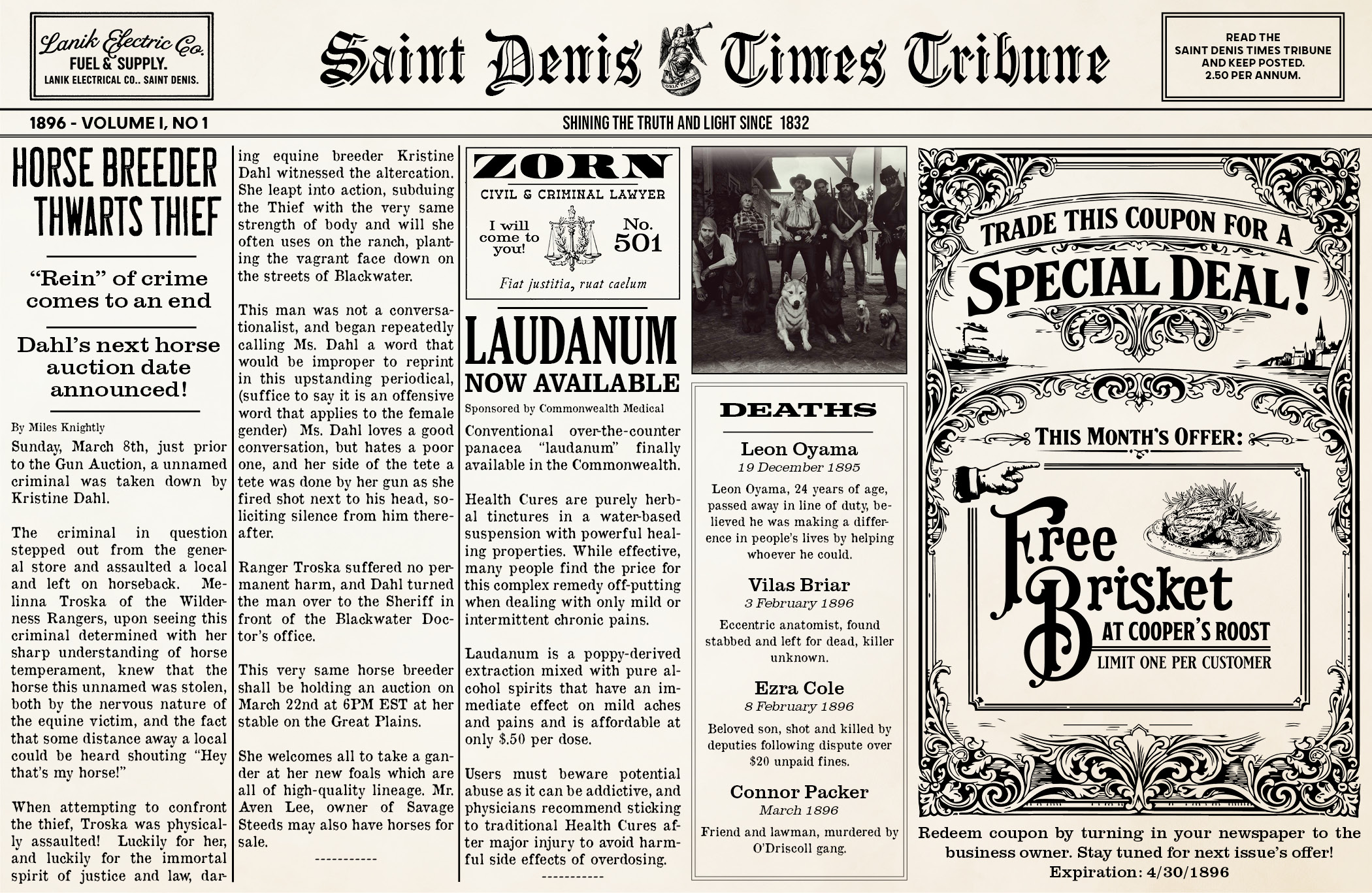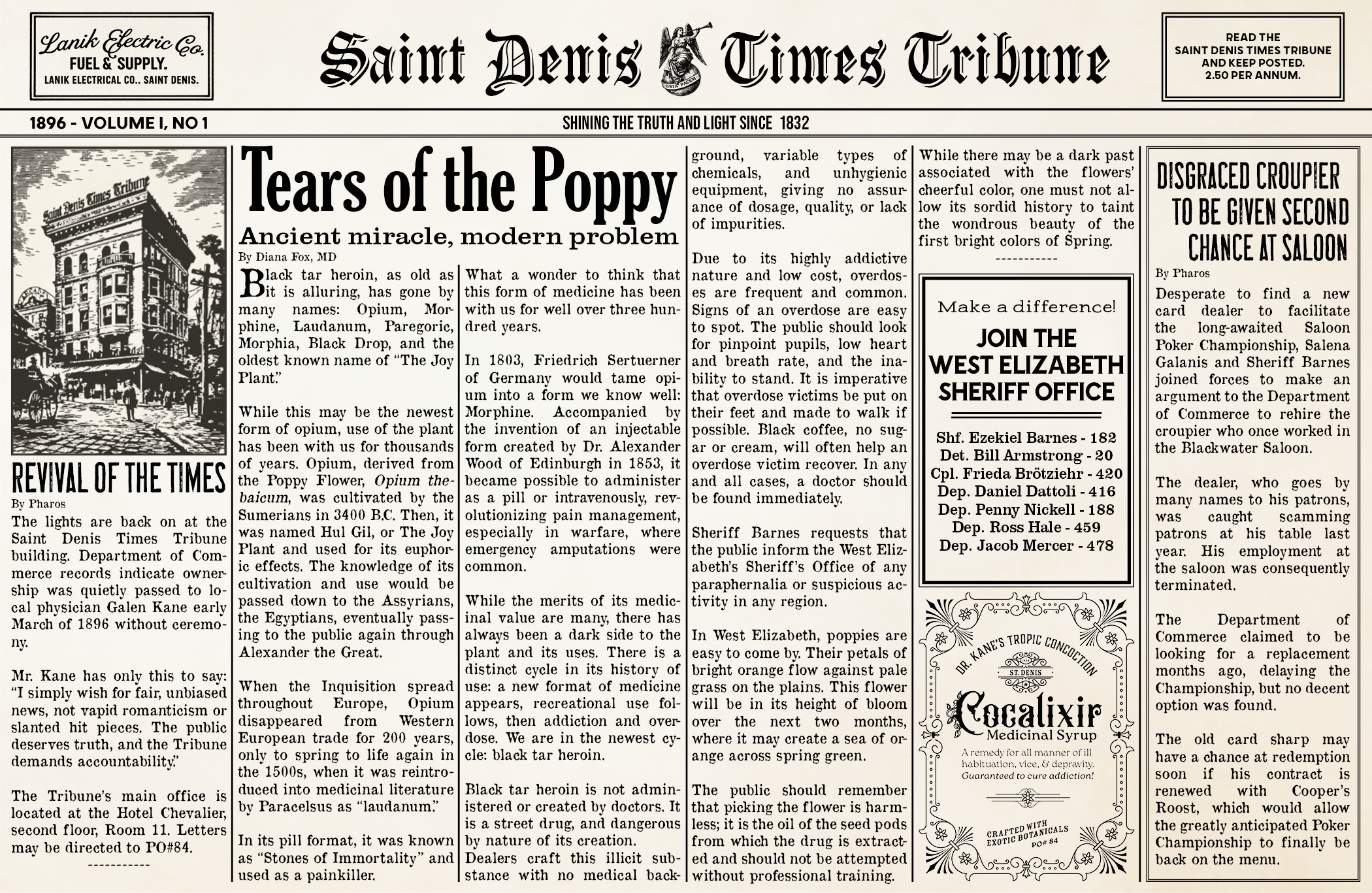 One of my side hobbies is recreating period graphic design and layouts, so naturally making a newspaper is something I find incredibly entertaining. In my RedM roleplay server, I was offered an opportunity to start up a newspaper “business” on my character Dr. Kane.